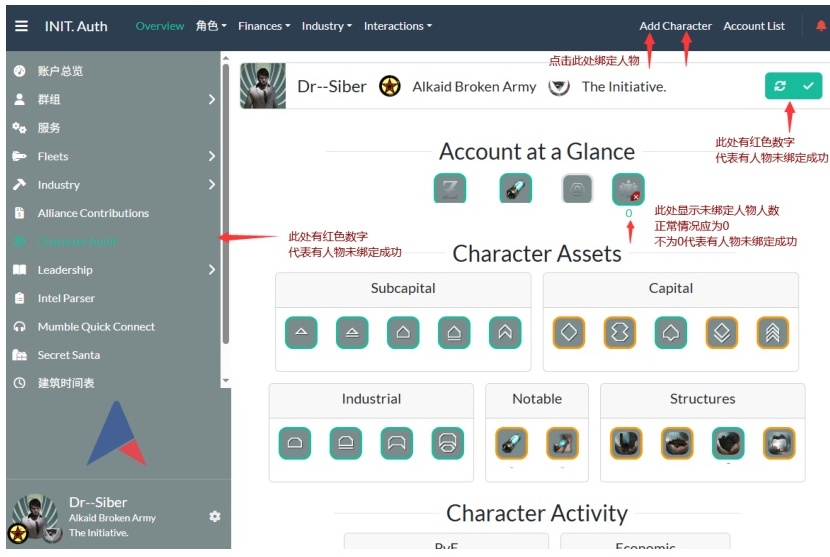 由于国内网络问题,很多时候即使绑定了人物,信息同步也有所延迟,此时auth会在图中表示的位置显示红色数字,代表有人物未同步数据,如图所示( )1